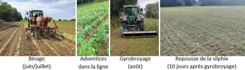 Plus précisément, les essais réalisés en cours de projet ont montré que le « schéma » de désherbage mécanique le plus adapté à la culture de silphie consiste en 2 passages de bineuse suivis d’un éventuel girobroyage complet de la parcelle, silphie comprise. Attention, ce girobroyage ne peut être réalisé qu’à condition que la silphie ait atteint un stade minimum de 6 à 8 feuilles. Il n’est réalisé qu’en cas de fort salissement dans les lignes. S’il doit être exécuté, celui-ci s’effectue à ras du sol généralement fin août / début septembre soit environ trois mois après le semis et après les deux premiers passages de bineuse. Bien sûr, ce schéma de désherbage mécanique s’adapte au cas par cas : un seul binage s’avère parfois suffisant sur des parcelles à faible pression d’adventices tandis que des interventions supplémentaires peuvent être nécessaires dans le cas inverse. Le girobroyage présente aussi l’avantage d’éviter la montée en graines des adventices. La silphie n’étant de toutes façons pas récoltée lors de l’année de son implantation, ce gyrobroyage n’est donc pas pénalisant outre mesure. Il peut toutefois avoir un léger impact sur la quantité de biomasse produite en deuxième année.