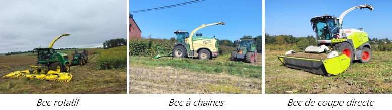 La récolte s’effectue à l’aide d’une ensileuse à maïs tout à fait classique. Plusieurs types de becs ont pu être évalués durant le projet. Il en ressort que les becs rotatifs à grandes toupilles sont efficaces à conditions que la silphie soit suffisamment sèche. Les becs à chaines fonctionnent également même si des bourrages ont pu être constatés en cas de légère verse. Les becs de coupe directe apparaissent comme étant plus efficaces spécifiquement dans les cas où la silphie a tendance à rester plus humide (cas de l’année 2024 où les conditions météorologiques particulières n’ont pas permis d’atteindre des taux de M.S idéaux). L’utilisation de lames latérales verticales permettant de mieux « trancher » la silphie pourrait améliorer significativement l’efficacité de ces becs mais cela n’a pas pu être évalué dans le cadre de l’étude.