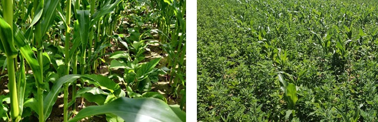 La présence de maïs dans l’inter-rang de silphie empêche le passage d’une bineuse classique. Il est donc préférable d’éviter cette association lorsque cette contrainte est connue au risque de se retrouver sans solution pour contrôler le développement des adventices.