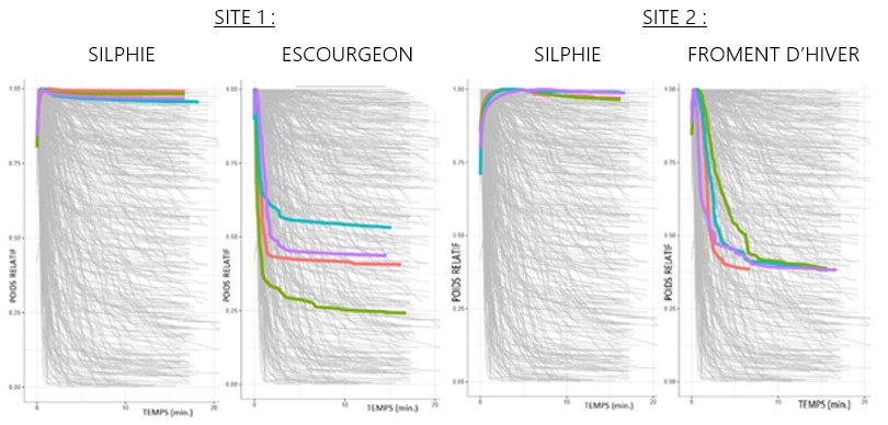 L’axe des abscisses représente le temps de dégradation de l’échantillon, tandis que l’axe des ordonnées indique son poids relatif. Les courbes bleue, mauve, rouge et verte traduisent donc l’évolution du poids relatif de chacune des mottes de terre prélevées, une fois plongées dans l’eau. Les graphiques révèlent très clairement la stabilité structurale importante des mottes de terre issues de la culture de silphie. Lors de ces mesures, les cutures de silphie étaient en place depuis 3 années sur chacune des deux parcelles étudiées (semis 2021 et prélèvements 2024). Cette stabilité structurale favorable est un très bon indicateur de la capacité d’un sol à résister à l’érosion.