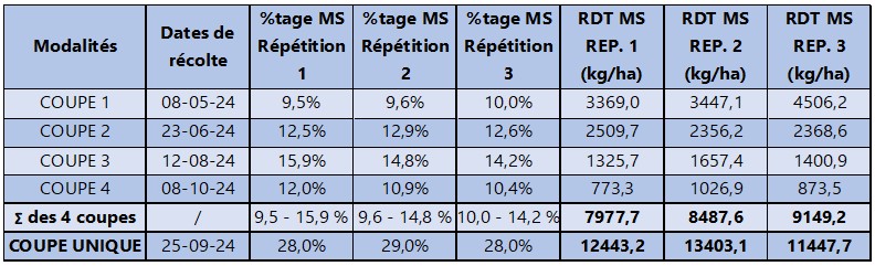 Parallèlement à ces résultats relatifs à la qualité du fourrage de silphie, des observations menées en 2023 semblaient indiquer un impact négatif de la multiplication des fauches sur le rendement annuel global. Un essai spécifique a dès lors été mis en place en 2024 entre une modalité « 4 fauches » et une modalité « coupe unique » (valorisation énergétique). Les résultats confirment les observations préalables avec une perte significative de rendement en matière sèche pour la modalité « 4 fauches ».