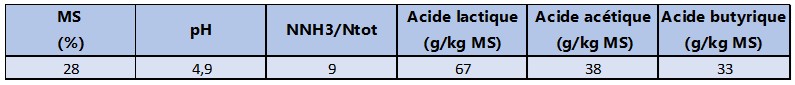 (*) Les valeurs VEM sont données à titre indicatif mais sont à considérer avec beaucoup de précaution. Il est également important de préciser que l’ensemble des valeurs concernent des échantillons pris avant la conservation. Les résultats sont basés sur un nombre limité d’analyses tandis que les valeurs ont été obtenues via des analyses NIR (infrarouge proche) qui peuvent sensiblement s’écarter des analyses chimiques de référence.